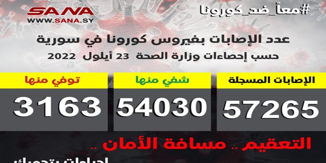 משרד הבריאות מסר כי מספר המאומתים הכולל בסוריה עמד על 57265 מהם החלימו 54030 בנוסף ל-3163 שהלכו לעולמם.