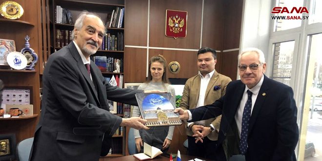 שגריר סוריה ברוסיה ד”ר בשאר אלג’עפרי דן עם מנהל ספריית הספרות הזרה במוסקבה באפל קוזמין בדרכי פתוח יחסי התרבות הסורית –רוסית.