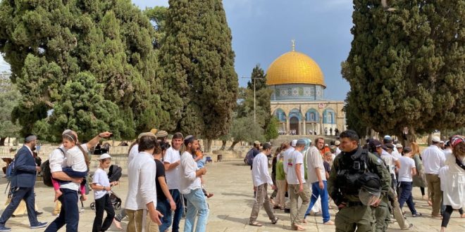 11/04/2023 אלקודס – סאנא עשרות מתנחלים קיצונים ישראלים פשטו היום על רחבות מסגד אל-אקצא המבורך . סוכנות ו’פא דיווחה כי עשרות מתנחלים פשטו על המסגד, דרך שער המוגרבים תחת אבטחתם של החיילים הישראלים . המתנחלים הקיצונים פשטו על מסגד אל אקצא 2023-04-11 sammar