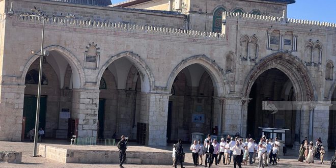 סוכנות ו’פא דיווחה כי מתנחלים ישראלים פרצו למסגד אל-אקצא מכיוון שער המוגרבים ביצעו סיורי פרובוקציה ברחבותיו, בשמירה קפדנית מטעם כוחות הכביוש, אשר הטילו הגבלות חריפות על כניסת המתפללים למסגד.