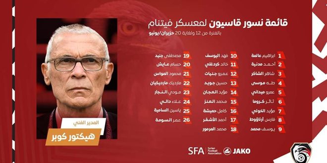 מאמן נבחרת סוריה בכדורגל, הקטור קופר, הכריז על רשימת השחקנים שישתתפו במשחק הידידות עם וייטנאם לקראת גמר אסיה.