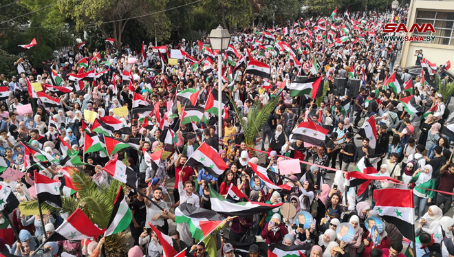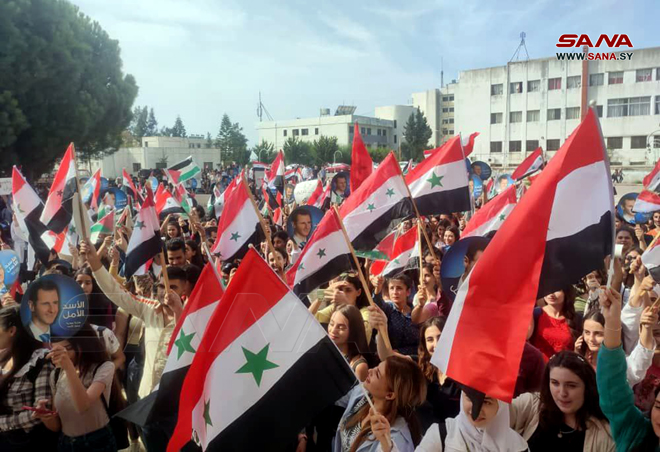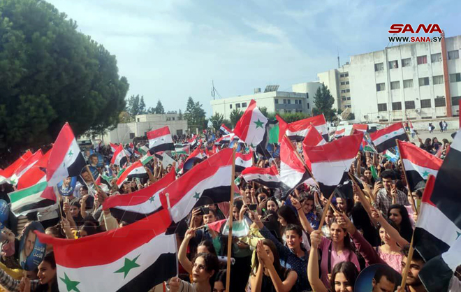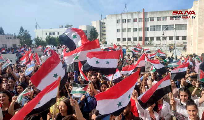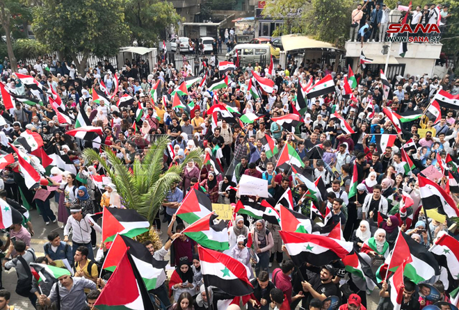 הסטודנטים הסורים התאספו היום באוניברסיטאות ובמכונים כאות סולידריות ותמיכה בהתקוממות הפלסטינית ובמבצע טופאן אל-אקצא מול ההתקפות האכזריות של הכיבוש הישראלי.