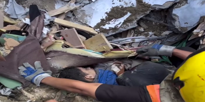אנחנו כאן תחת ההריסות היא זעקתו של פלסטיני מתחת להריסות בעזה, שאותה הוא צועק להגנה האזרחית ולצוותי האמבולנס ששומעים אותו וממהרים לחלץ אותו מתחת להריסות ביתו שנהרס ע”י הכיבוש הישראלי הפשיסטי. זעקה שמייצגת את שופרם של אלפי פצועים שהוצאו והועברו לבתי חולים, בעוד שצעקות רבות נוספות השתתקו מתוך 2,550 הפלסטינים, בהם 1,350 ילדים, לנצח מתחת לטונות של הריסות, בגלל שאנשי ההצלה הצוותים הרפואיים לא הצליחו להגיע אליהם, בגלל הפצצות קשות והיעדר הציוד.