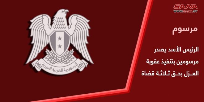 26/03/2024 דמשק – סאנא הנשיא מר בשאר אל-אסד הוציא שני צווים למימוש עונש ההדחה שקבלה מועצת המשפט העיליונה נגד 3 שופטים, וזאת על רקע בצוע הפרות וטעויות חמורות. הנשיא אל-אסד הוציא שני צווים למימוש עונש ההדחה נגד 3 שופטים 2024-03-26 sammar