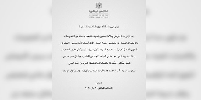נשיאות הרפובליקה הערבית הסורית הודיעה על גילוי סימני מחלת הגברת הראשונה אסמאא אל-אסד במחלת לוקמיה.