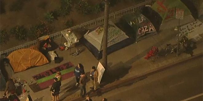 מוחים בלוס אנגלוס העיר הכי גדולה במדית קליפורניה האמריקנית, הקימו מול בניין העירייה מחנה הזדהות עם הפלסטינים ונגד התוקפנות הישראלית הממושכת נגד רצועת עזה.