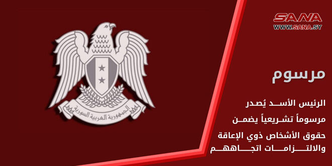 21/07/2024 דמשק – סאנא הנשיא בשאר אל-אסד הוציא צו תחיקתי מס’ (19) לשנת 2024 בדבר זכויותיהם של אנשים עם מוגבלות וחובותיהם של גורמים ציבוריים ופרטיים כלפיהם. הנשיא אל-אסד מוציא צו תחיקתי המבטיח את זכויותיהם של אנשים עם מוגבלות וחובות כלפיהם 2024-07-21 mouhmad