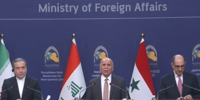 במהלך מסיבת עיתונאים משותפת שכינסו בבירה העיראקית בגדאד, הדגישו שרי החוץ הסורי, העיראקי והאיראני את הצורך להילחם בכל חבורות הטרור בשל שהן לא מאיימות רק על ביטחון סוריה אלא גם כן על ביטחון האזור כולו, ובהקשר זה אמר שר החוץ והמהגרים בסאם סבאע’ כי הוא ערך שורת שיחות עם עמיתיו העיראקי והאיראני ובפניהם הבהיר את כל ההתפתחויות בשדה הקרב וסקר את כל האיומים הבטחוניים בעקבות מתקפת הטרור שבוצעה נגד מחוזות חלב, חמאת וחומס, שם הותקפו התושבים האזרחים בלב בתיהם, ובכן ישנו צורך דחוף בגיוס כל היכולות והמאמצים של מדינות ערב ואיסלאם כדי להילחם בטרור ובטרוריסטים, וכעת מדינות רבות הביעו סולידריות עם סוריה ואחדות שטחיה ובניה.