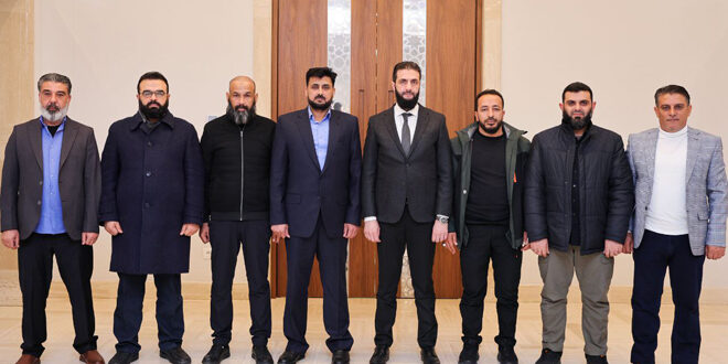 דמשק- סאנא משלחת צמרת תנועת השחרור והבנוי מברכת את נצחון המהפכה הסורית החדשה בפני מפקד הממשל הסורי החדש אחמד אל-שרע.