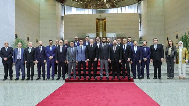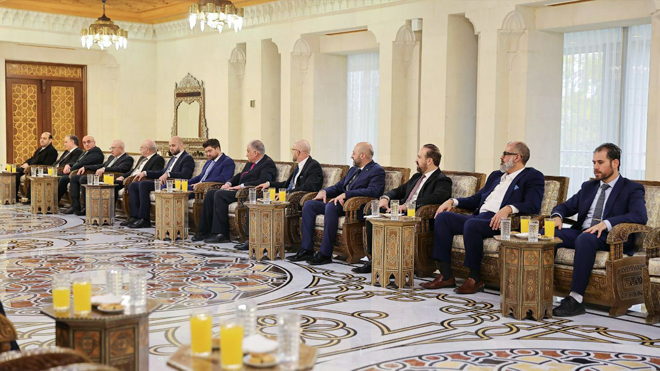 14/02/2025 דמשק – סאנא נשיא הרפובליקה הערבית הסורית אחמד א-שרע נפגש היום בארמון העם עם משלחת של פעילים סורים בקנדה. הנשיא א-שרע נפגש בארמון העם עם משלחת של מומחים אמריקנים ממוצא סורי 2025-02-14 nedal1
