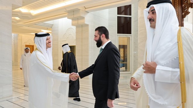 הנשיא א-שרע והשר אל-שיבאני מגיעים לדיוואן האמירי בדוחא 2025-04-15