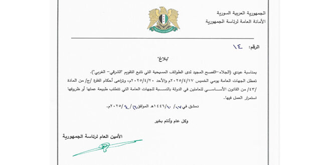 המזכירות הכללית של נשיאות הרפובליקה פרסמה הודעה לפיה מוסדות ציבוריים לא יעבדו בימי חמישי וראשון הבאים, לרגל שני החגים (האווקואציה וחג הפסחא של עדות נוצריות העוקבות אחר לוח השנה ה”מזרחי-מערבי”).