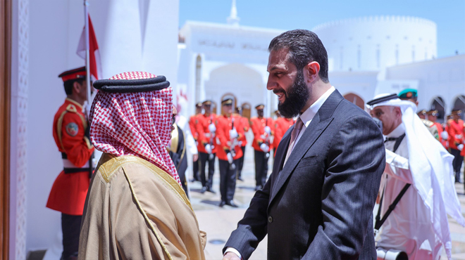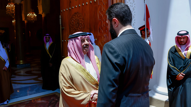 10/05/2025 הנשיא אחמד א-שרע נתקבל על ידי הוד מלכותו המלך חמד בן עיסא אל ח'ליפה מלך ממלכת בחרייןבארמון א-סח'יר 2025-05-10 nedal1