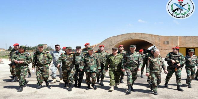 הרמטכ”ל גנרל עלי איוב בביקור בבסיס אל-שועייראת האווירי שבפאתי חומס הדרום – מזרחיים שם עמד מקרוב על גודל הנזק שנגרם לבסיס בשל התוקפנות האמריקנית, ונפגש עם הטייסים והטכנאים אשר הסבירו בפניו את טבע משימתם ואת תנאי התוקפנות האמריקנית המתועבת .