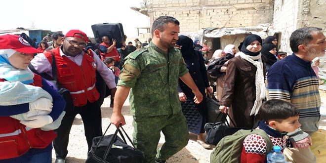 Новая группа жителей северной части Восточной Гуты смогла покинуть контролируемые бандформированиями районы через гуманитарный коридор в лагере Аль-Вафидин.