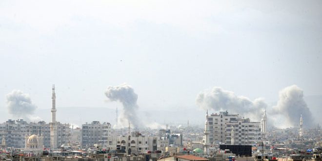Военный корреспондент агентства САНА сообщил, что, основываясь на информации разведки и визуальных наблюдениях, были нанесены прицельные, точные удары по позициям, укрытиям и огневым точкам террористов в районе Хаджар Аль-Асвад на юге Дамаска. Бандформированиям причинён значительный ущерб в живой силе и технике.