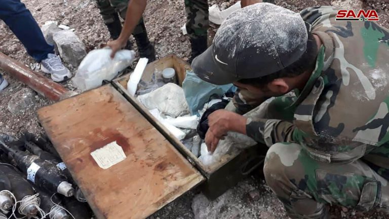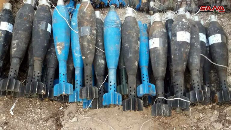 Компетентные органы в населённом пункте Тер- Мааля на севере провинции Хомс сегодня нашли склад с минометами, боеприпасами для них и взрывчатыми веществами, оставленные террористами, передал корреспондент агентства САНА в Хомсе.