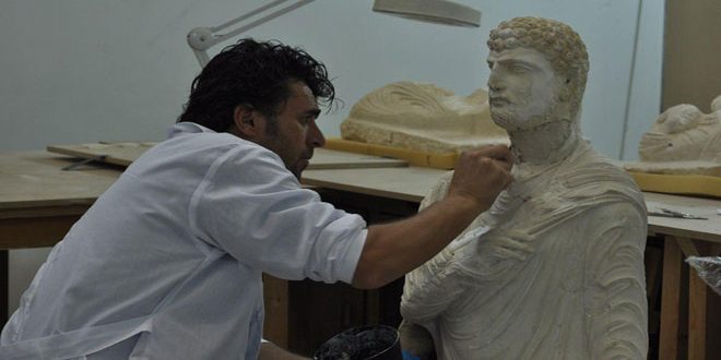 Группа реставраторов и экспертов Главного управления древностей и музеев САР работает над восстановлением разрушенных каменных скульптур Пальмиры, которые были доставлены в Дамаск.