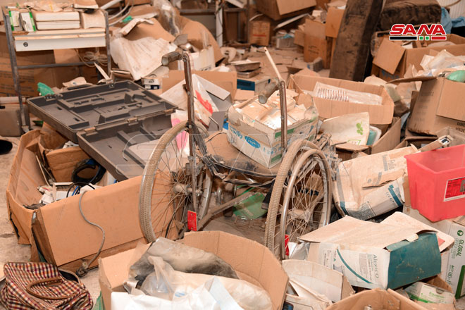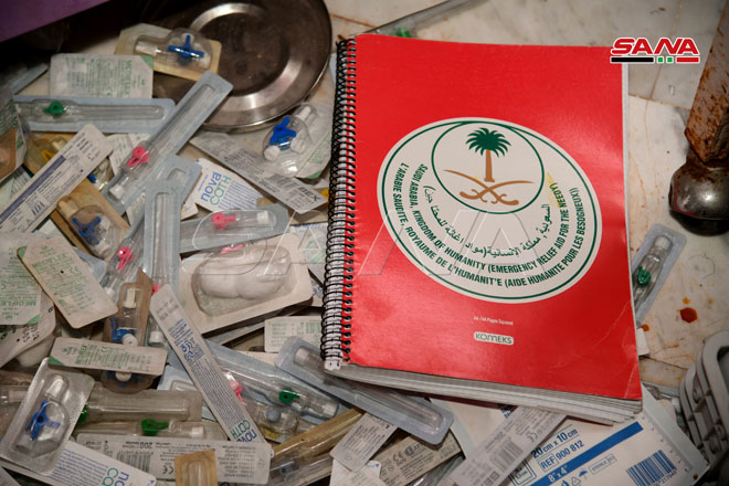 Корреспондент агентства САНА сообщил, что военнослужащие в ходе прочесывания недавно освобожденного поселка обнаружили полевой госпиталь террористов, оборудованный в частной школе имени арабского ученого-химика Ибн Хайяна. В числе найденного – медицинское оборудование, оборудование для автомобилей скорой помощи, медицинские маски, одежда, противогазы, несколько коек и медикаменты, в том числе саудовские и катарские.