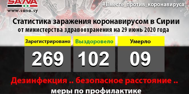 В заявлении ведомства, копию которого получило агентство САНА, указано, что число зарегистрированных случаев заражения коронавирусом в Сирии на сегодняшний день составляет 269, при этом 102 человека вылечились и 9 умерли.
