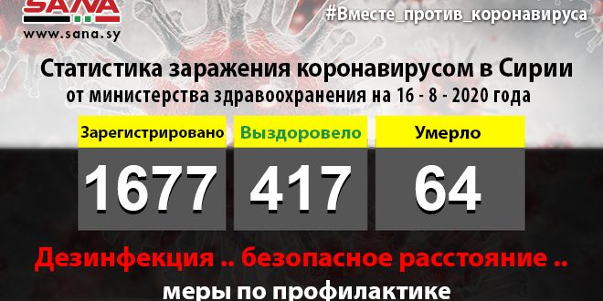 Министерство в заявлении агентству САНА указало, что число зарегистрированных зараженных достигло 1 677, из них 417 человек выздоровели и 64 умерли.