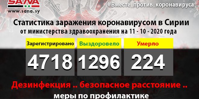 Министерство указало в заявлении, копию которого получило агентство САНА, что общее число выявленных инфицированных достигло 4 718, 1 296 человек выздоровели и 224 скончались.