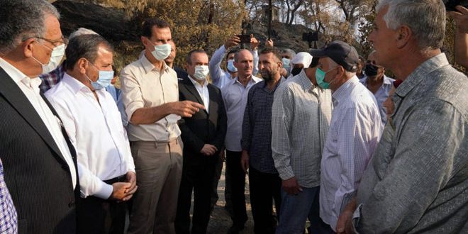 Президент САР Башшар Аль-Асад посетил селение Баллюран на севере провинции Латакия, чтобы ознакомиться с ущербом и встретиться с жителями в рамках инспекционной поездки по пострадавшим от пожаров районам.