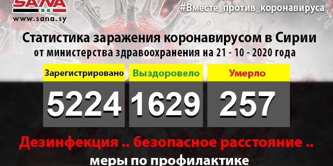 В заявлении ведомства, копию которого получило агентство САНА, указано, что общее число инфицированных, выявленных в Сирии, составило 5 224, из них 1 629 человек выздоровели, а 257 скончались.