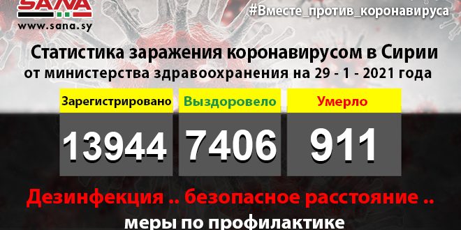В заявлении ведомства, копию которого получило агентство САНА, указано, что общее число зарегистрированных в Сирии зараженных на данный момент достигло 13 944, из них 7 406 человек выздоровели, а 911 умерли.