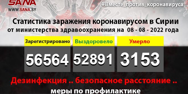 В заявлении ведомства указано, что на данный момент в Сирии зафиксировано 56 564 заразившихся COVID-19, из которых 52 891 человек вылечился и 3 153 умерли.