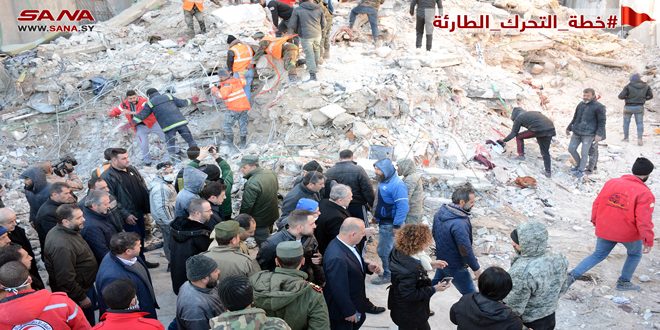 Премьер-министр САР Хусейн Арнус ознакомился с текущей работой по разбору завалов, поиску выживших и жертв землетрясения в разрушенном землетрясением южном квартале Рамель Аль-Дженуби города Латакия.