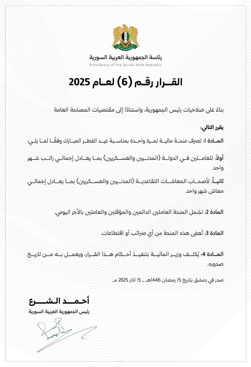 Президент Ахмад Аш-Шараа издал решение о выплате финансового пособия гражданским государственным служащим и военным по случаю праздника Ид Аль-Фитр.
