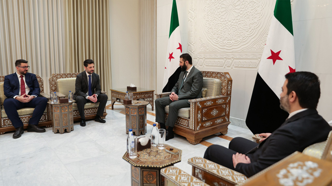 Президент Сирии Ахмад Аш-Шараа принял исполнительного директора Всемирного экономического форума Мирона Кироза, Встреча прошла в Народном дворце в Дамаске в присутствии министра иностранных дел Сирии Асаада Аш-Шибани.