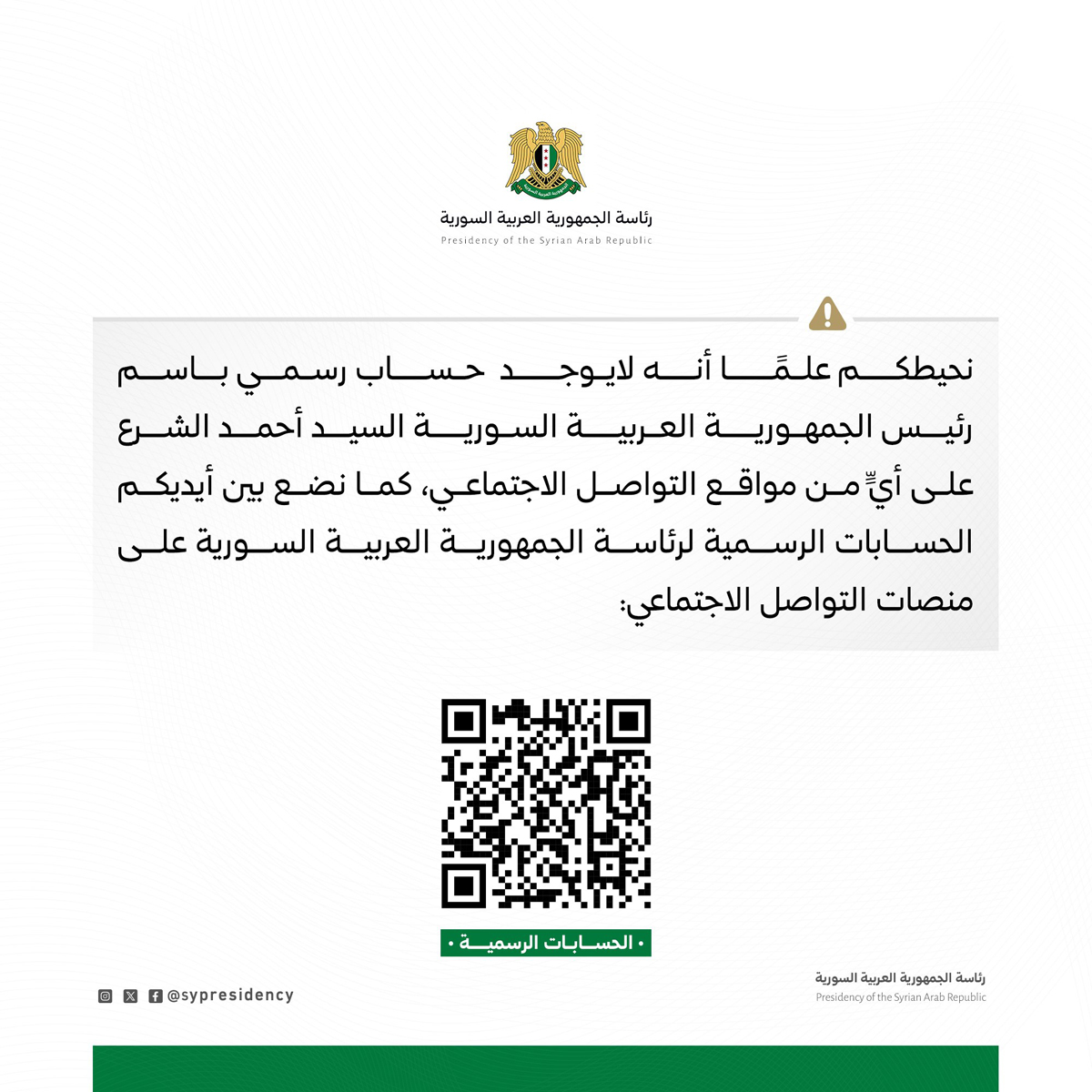 В заявлении Канцелярии говорится: «Мы сообщаем, что ни на одном из сайтов социальных сетей нет официального аккаунта на имя президента Сирийской Арабской Республики Ахмада Аш-Шараа. Мы также предоставляем официальные аккаунты Канцелярии президента Сирийской Арабской Республики на платформах социальных сетей».