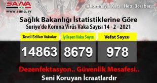 ŞAM – Sağlık Bakanlığı dün akşam Suriye’de 79 şifa vakasına karşılık 43 koronavirüs vakasının kaydedildiğini 3 vakanın da vefat ettiğini ilan etti. Sağlık Bakanlığının yayınladığı ve SANA’nın bir nüshasını …
