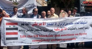 SAN’A – Yemen’in başkenti Sana’da bulunan Suriye büyükelçiliği önünde bugün düzenlenen dayanışma standına katılanlar, Suriye’ye uygulanan haksız Amerikan ablukasının kaldırılması çağrısında bulunarak, yıkıcı deprem felaketinin kurbanlarına karşı Batılı ülkelerin uyguladığı …