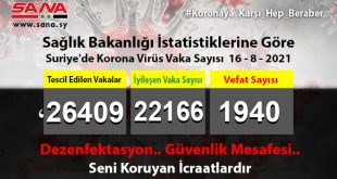 ŞAM – Sağlık Bakanlığı, yeni 45 koronavirüs vakasının tescil edildiğini, tescil edilen vakalardan 17’sinin şifa bulduğunu, 2’sinin de vefat ettiğini ilan etti. Bakanlık yayınladığı ve SANA’nın nüshasını aldığı beyanda, Suriye’de …