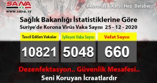 Sağlık Bakanlığı bugün, 120 Koronavirüs vakasının tescil edildiğini, Suriye’de tescil edilen toplam koronavirüs vakalarından 51 vakanın şifa bulduğunu, 8 vakanın da vefat ettiğini ilan etti. Bakanlık yayınladığı ve SANA’nın bir …
