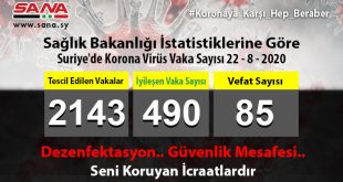 ŞAM – Sağlık Bakanlığı bugün, yeni 70 korona virüs vakasının tescil edildiğini, Suriye’de tescil edilen vakalardan 15’inin iyileştiğini, 1 vakanın da vefat ettiğini ilan etti. Bakanlık bugün yayınladığı ve SANA’nın …