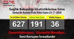 ŞAM – Sağlık Bakanlığı bugün Suriye’de yeni 23 koronavirüs vakasının tescil edildiğini, 9 vakanın şifa bulduğunu 2 vakanın da vefat ettiğini ilan etti. Bakanlığın bugün yayınladığı ve SANA’nın bir nüshasını …