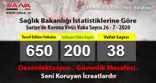 Şam – Sağlık Bakanlığı bugün Suriye’de yeni 19 koronavirüs vakasının tescil edildiğini, 7 vakanın şifa bulduğunu 1 vakanın da vefat ettiğini ilan etti. Bakanlığın yayınladığı ve SANA’nın bir nüshasını aldığı …