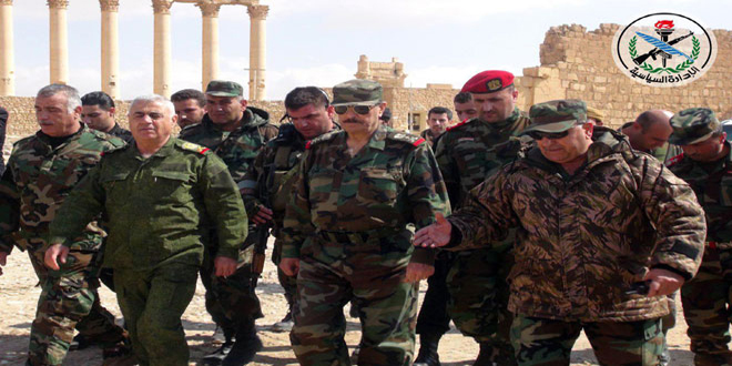 HOMS – Ordu ve Silahlı Kuvvetler Genel Komutan Yardımcısı Savunma Bakanı Korgeneral Fahd Casim el Freyc Homs İlinin doğusunda ordu birliklerimizin IŞİD’ten kurtardıkları Tedmur – Palmira Bölgesinde askeri birliklerimizi ziyaret etti.