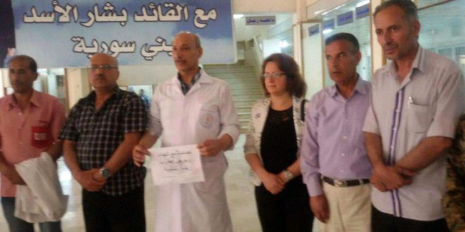 Katılımcılar şehit ve yaralılarla dayanışma eylemleri ardından hastanede IŞİD ve diğer terör örgütlere karşı onurlu ve kahramanca savaşan Suriye ordusuna desteklerinin bir ifadesi olarak kan bağışı kampanyasında bulundular.