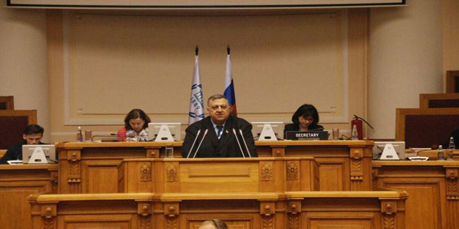 Halk Meclisi Başkanı Sabbağ, Uluslararası Parlamentolar Birliğinin Petersburg Kentinde düzenlediği dönem toplantılarında konuşuyor