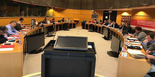 BRÜKSEL – Yunanistan İşçi Birliğinin daveti üzerine ‘Tüm İşçilerin Direniş Cephesi’ sloganı altında Avrupa Birliği Parlamentosunun Brüksel’deki merkezinde düzenlenen sendikal sempozyum katılımcıları Suriye ve halkına uygulanan katı yaptırımların derhal kaldırılmasını talep ettiler.