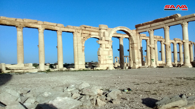 Tedmur’daki SANA muhabiri, turizm mevisminin yaklaşmasıyla birlikte turistik heyetleri karşılamak için hazır ve layık olması için tarihi kentin canlılığını yeniden kazanmak amacıyla, Tedmur Tarihi Eserler Müdürlüğüne bağlı atölyelerin bu sabah terör saldırıları sonucunda oluşan toprağın tarihi kentin cadde ve sokaklarıyla terörün ulaştığı mekanlardan kaldırmaya ve kent dışında enkazlar için tahsis edilen yerlere taşınmauya başlandığını ifade etti.