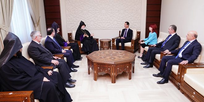 14/05/2019 Cumhurbaşkanı el Esad Büyük Kilikya Evinde Ermeni Katolikosu I. Aram Keşişyan ve Suriye ziyaretinde ona eşlik eden heyeti kabul ediyor 2019-05-14 admin