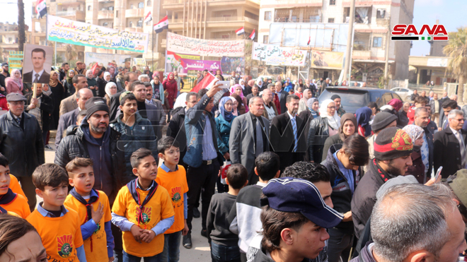 Tolanmaya katılanlar, Suriye Arap Ordusu’nun teröre karşı zaferlerinin bütün dünyaya, Suriye’nin hiçbir karış toprağına taviz vermeyeceğine bir kanıt olduğunu belirtti.