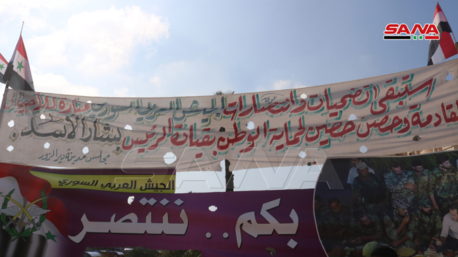 DEYREZZOR – Deyrezzor Kenti’nin El İntisar Meydanı Suriye Arap Ordusu’nun Halep’in batı ve kuzeybatı kırsallarında teröristlere karşı kaydettiği zaferleri kutlaayan yoğun bir halk toplanmasına şahit oldu.