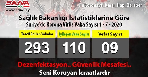 SANA’nın bir nüshasını aldığı beyanda Sağlık Bakanlığı; bugünkü verilerle Suriye koronavirüs vakalarının sayısının 293’e ulaştığını, 110 vakanın şifa bulduğu ve 9 vakanın vefat ettiğine işaret etti.